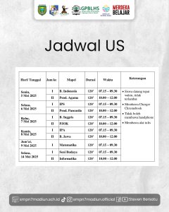 Sudah siap dengan Ujian Sekolah untuk Kelas 9? Yuk, catat jadwalnya dan jangan sampai ada yang terlewat! Kelas 7&8 mulai dari tanggal 5-14 Mei 2025 mengikuti pembelajaran daring sesuai dengan jadwal dan wajib mengumpulkan tugas di Google Classroom sesuai dengan jadwal pengumpulannya! SMP Negeri 7 Madiun #UjianSekolah #BersatuUntukMaju