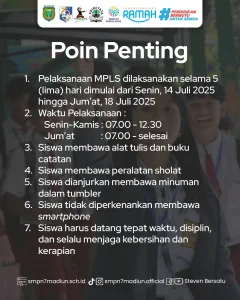 Berikut adalah pelaksanaan Masa Pengenalan Lingkungan Sekolah (MPLS) 2025 yang diselenggarakan di SMP Negeri 7 Madiun. Mari kita ciptakan suasana belajar yang menyenangkan!