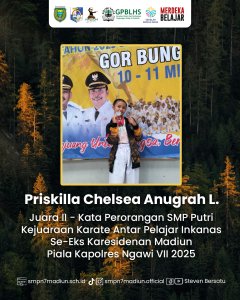 Selamat kepada siswi SMP Negeri 7 Madiun Priskilla Chelsea Anugrah L. yang telah memperoleh prestasi yaitu Juara II Kata Perorangan SMP Putri Kejuaraan Karate Antar Pelajar Inkanas Se-Eks Karesidenan Madiun Piala Kapolres Ngawi VII 2025 yang diselenggarakan di Ngawi pada Mei 2025.