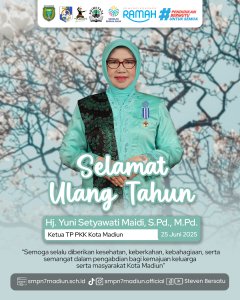 Selamat Ulang Tahun kami ucapkan pada Ketua TP PKK Kota Madiun Ibu Hj. Yuni Setyawati Maidi, S.Pd., M.Pd. pada 25 Juni. Semoga selalu diberikan kesehatan, keberkahan, kebahagiaan, serta semangat dalam pengabdian bagi kemajuan keluarga serta masyarakat Kota Madiun.