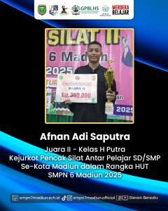 Selamat kepada Wasis Setyo Sasongko (9F) yang memperoleh Juara I Kelas F Putra dan Afnan Adi Saputra (8E) yang memperoleh Juara II Kelas H Putra dalam Kejurkot Pencak Silat Antar Pelajar SD dan SMP Se-Kota Madiun Dalam Rangka HUT SMPN 6 Ke-46 2025