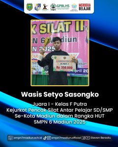 Selamat kepada Wasis Setyo Sasongko (9F) yang memperoleh Juara I Kelas F Putra dan Afnan Adi Saputra (8E) yang memperoleh Juara II Kelas H Putra dalam Kejurkot Pencak Silat Antar Pelajar SD dan SMP Se-Kota Madiun Dalam Rangka HUT SMPN 6 Ke-46 2025